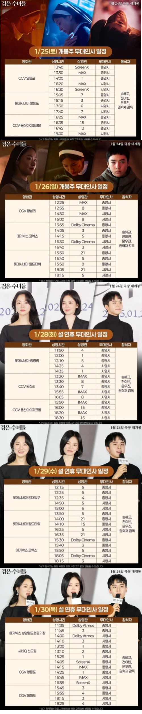 검은 수녀들의 무대인사 일정은 1/25(토)~26(일) 이틀과 설연휴인 1/28(화)~30(목)까지의 일정이 있습니다. 이번 시사회 일정이 공개된 만큼, 영화의 첫 공개를 경험할 수 있는 기회가 주어져 기대가 큽니다. 영화의 내용과 분위기를 사전에 접할 수 있는 중요한 시간이라, 관객들의 반응과 피드백을 직접 확인하며 작품에 대한 인사이트를 얻을 수 있을 것 같습니다. 시사회 후에는 영화에 대한 토론과 다양한 의견을 나눌 수 있는 자리가 마련되기를 기대하며, 그로 인해 영화의 깊이를 더욱 이해하고 즐길 수 있을 것입니다. 많은 관심과 참여가 기대되는 중요한 일정입니다.
